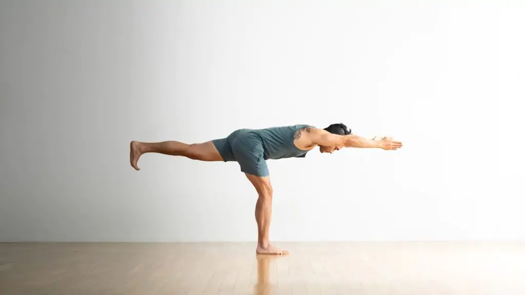 Warrior III challenges your balance and builds incredible core strength as you balance on one leg.